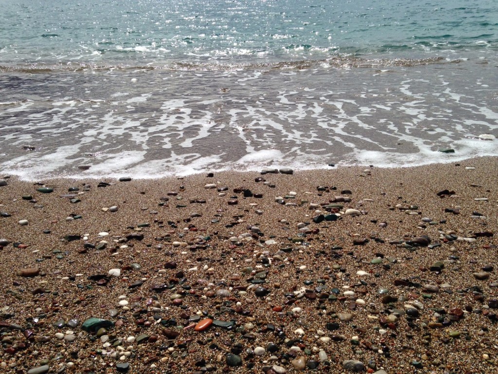 Catching the light rays among the rocks were also man-made objects of discarded glass and old tile. Even these were were made beautiful and smooth by the tumbling of the waves.