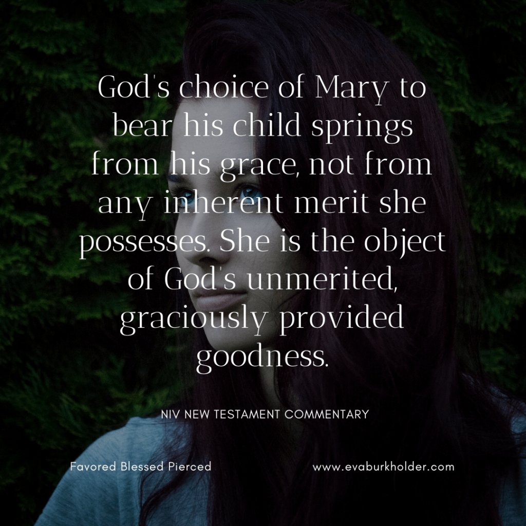 “Despite all her qualities, God’s choice of Mary to bear his child springs from his grace, not from any inherent merit she possesses. She is the object of God’s unmerited, graciously provided goodness. God acted on her behalf and not because of her.” [Darrell L. Bock, IVP New Testament Commentary Series: Luke (Downers Grove, IL: Crossway, 2018) 92.]