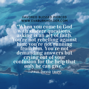 Father God, teach me to listen to you, to make our conversations about you, to hear what you are trying to say to me. Teach me the art of good question asking so that I can be a better friend and listener to my loved ones.