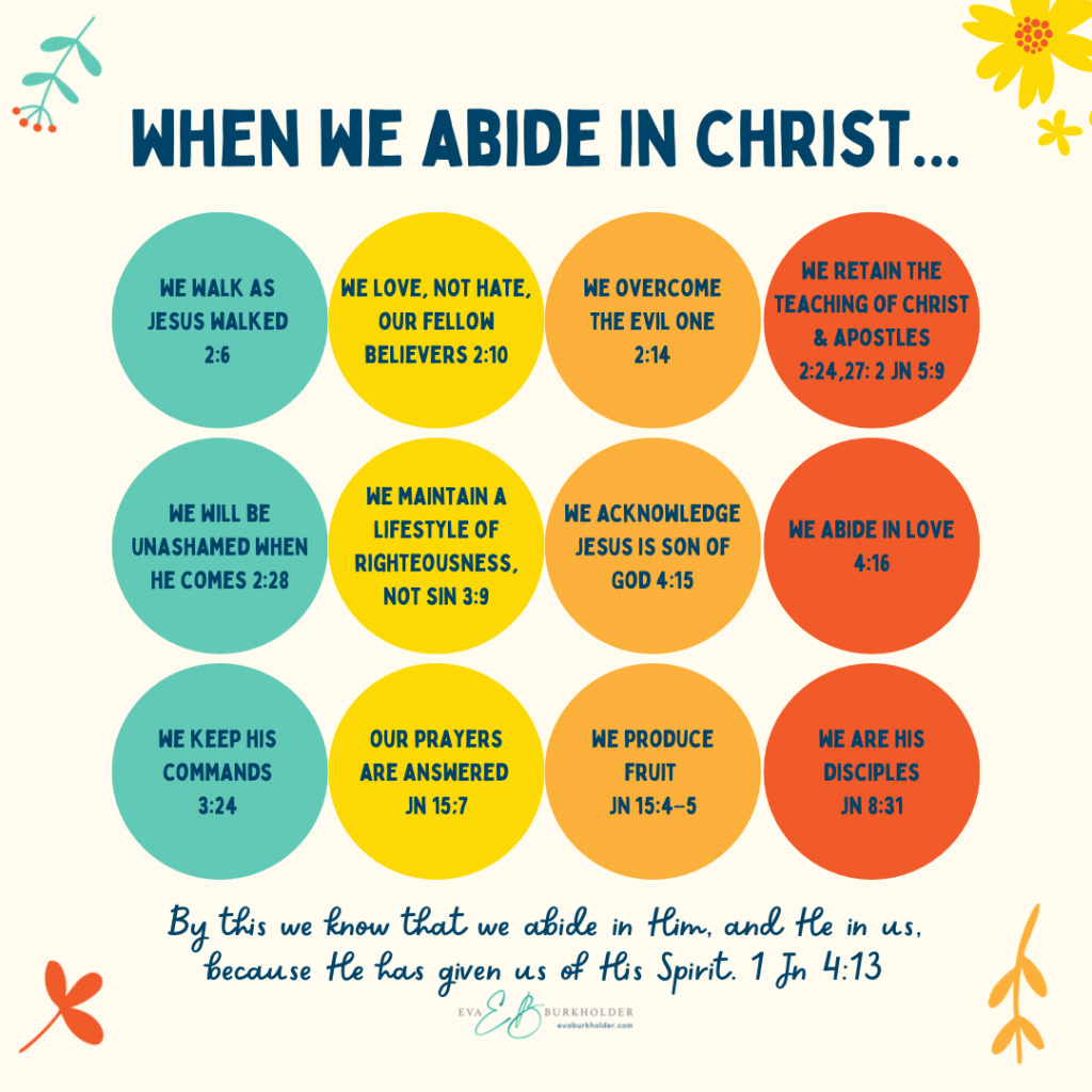 We are instructed to abide in the Father and the Son (1 Jn 2:24), the light (1 Jn 2:10), his word (Jn 8:31), and his love (Jn 15:9). Conversely the word of God (1 Jn 2:14), eternal life (1 Jn 3:15), the truth (the teaching of the apostles and Jesus) (1 Jn 2:24, 27, 2 Jn 1:2,9), and God’s seed (1 Jn 3:9) abide in us.