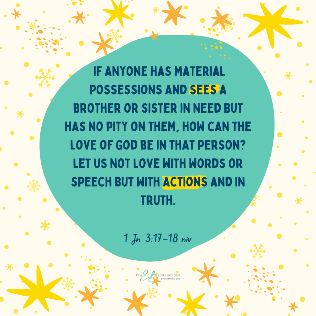 This is how we know what love is: Jesus Christ laid down his life for us. And we ought to lay down our lives for our brothers and sisters. If anyone has material possessions and sees a brother or sister in need but has no pity on them, how can the love of God be in that person? Dear children, let us not love with words or speech but with actions and in truth.