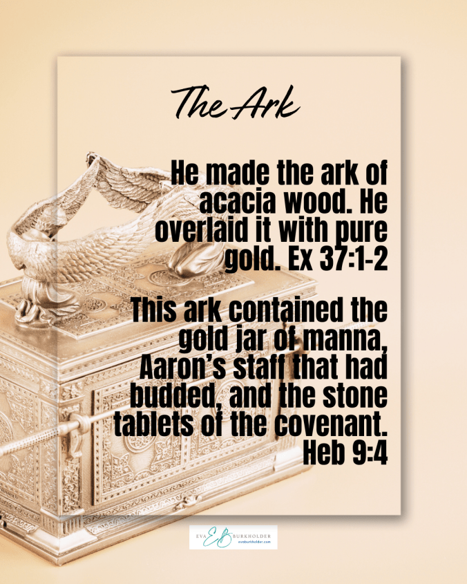 Also inside the ark were a gold jar of manna to remind them of God’s provision (Ex 16:32–34) and Aaron’s budding staff to confirm the priest’s authority (Num 17:8, 10).