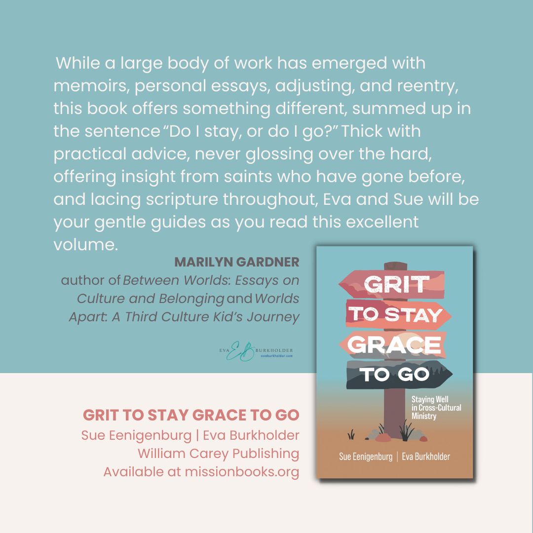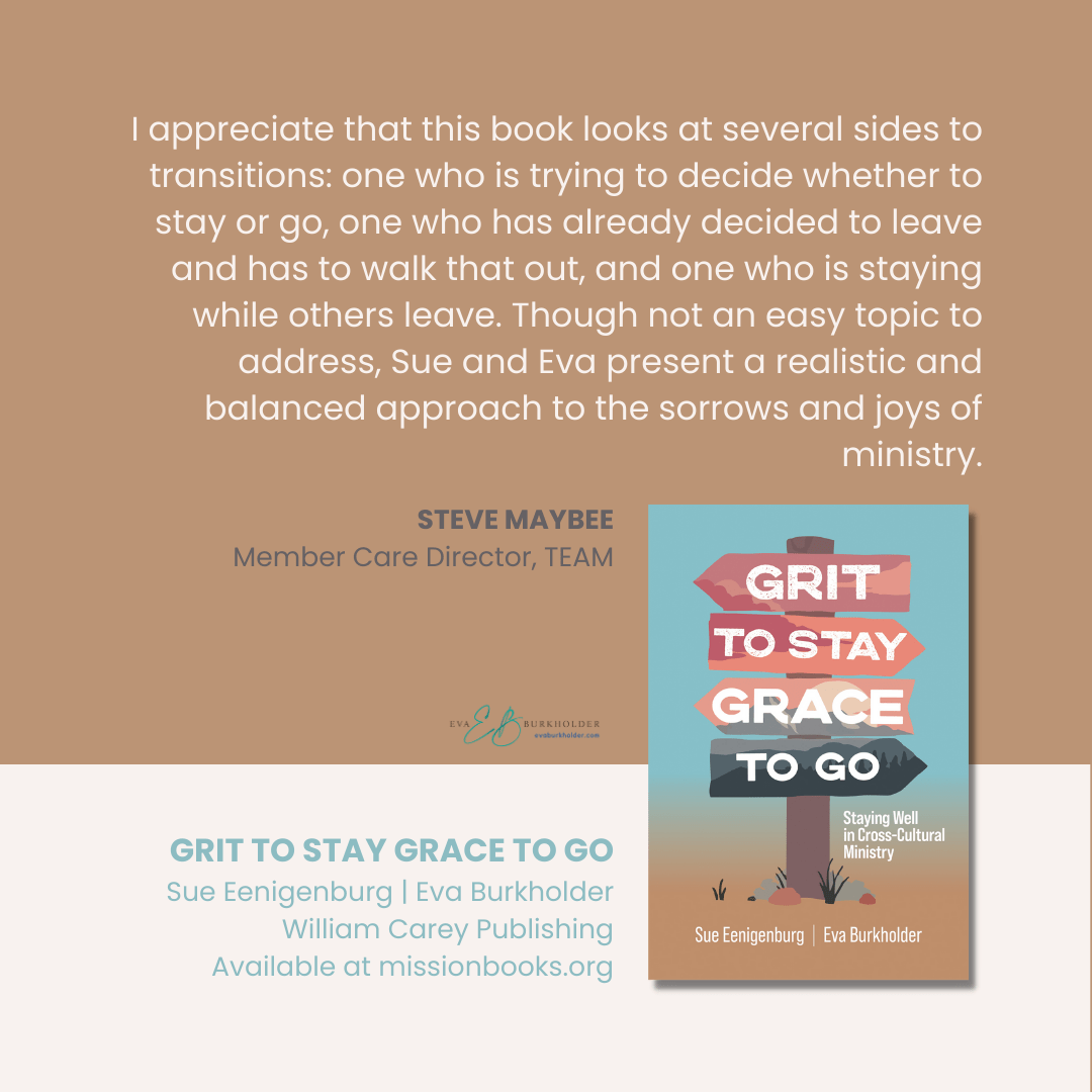 Grit to Stay Grace to Go: Staying Well in Cross-Cultural Ministry normalizes these challenges through honest and humorous stories. It encourages stayers to process their reactions well when saying goodbye to goers. And those considering leaving the field will find poignant questions to help them make an intentional decision.
